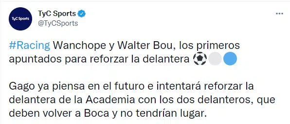 Aunque todavía le queda una fecha de este campeonato, Fernando Gago ya piensa en el 2022 que tendrá torneo local, Copa Argentina y Sudamericana para Racing. Es por eso que ya piensa en refuerzos y los dos primeros que suenan son dos jugadores de Boca, que están a préstamo en otros equipos: Walter Bou y Wanchope Ábila.