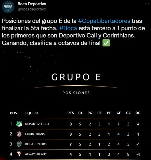 Para obtener la clasificación los resultados de Boca son bastantes sencillos. Por un lado, el elenco azul y oro deberá ganarle por cualquier resultado a Deportivo Cali. Incluso si Corinthians no triunfa ante Always Ready el conjunto xeneize se meterá en el selecto grupo de los mejores primeros. Logrando esa ubicación evitará en octavos de final a los rivales más débiles.