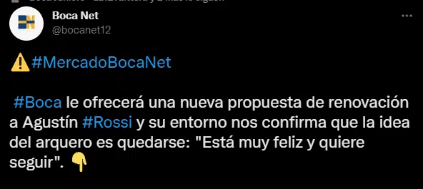 Agustín Rossi hoy es uno de los temas más importantes en la agenda de Boca en este corto plazo. De hecho por estas horas Juan Román Riquelme está pensando en una decisión que seguramente tendrá múltiples respuestas por parte de los hinchas del club en las redes sociales. Aunque la información que se brindó puede transmitir algo de tranquilidad.
