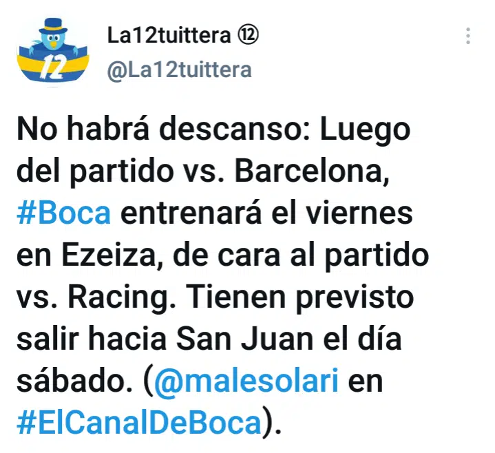 Una vez finalizado el partido entre Boca y Barcelona por la Copa Liberadores, el conjunto de Russo entrenará mañana viernes en Ezeiza pensando en el partido ante Racing del domingo 23 por las semifinales de la Copa de la Liga 2021. Por lo tanto no habrá descanso para el plantel, solo trabajos de regeneración para los futbolistas que se desempeñen esta noche ante el equipo ecuatoriano.