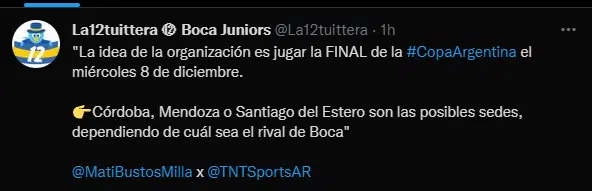 Hace unos minutos se supo de manera extraoficial que Boca ya tiene la fecha confirmada sobre la final de la Copa Argentina. Desde el ente que organiza el torneo están pensando programar la final para el día 8 de Diciembre. Aún el equipo xeneize no tiene su rival definido. Aún no se definió todavía donde será la sede, pero está claro que será en el interior del país.