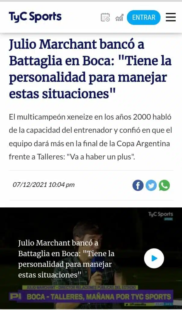 El exvolante de Boca, Julio Marchant, habló en la previa a la final de Copa Argentina. En ese sentido, apoyó a Sebastián Battaglia y realizó un análisis de su situación. Allí afirmó: Él conoce muy bien el club, nos ha tocado estar desde la pensión, pasó por todos los procesos, está capacitado. Obviamente que en el medio hay hechos y circunstancias que uno no quiere que pasen, pero tiene la personalidad como para saber manejar esas situaciones“