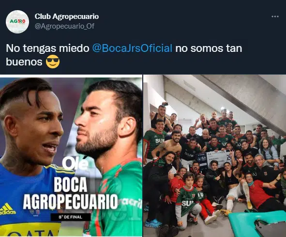 “No tengas miedo @BocaJrsOficial no somos tan buenos”, expresó el conjunto de Carlos Casares a través de su cuenta oficial de Twitter. Una publicación que rápidamente se hizo viral y contó con la respuesta del Xeneize, que felicitó a Agropecuario por la hazaña y le recordó que pronto se verían las caras en el certamen nacional.