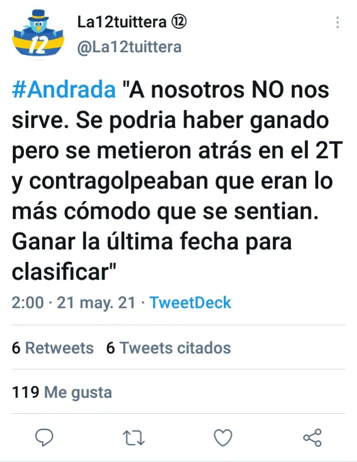Por la 5° fecha de la Copa Libertadores, Boca empató contra Barcelona sin goles en una jornada donde según los hinchas en redes, el equipo mostró un desempeño colectivo muy flojo. Al final encuentro, Estaban Andrada compartió su bronca por el resultado. “A nosotros no nos sirve. Se podría haber ganado pero se metieron atrás en el segundo tiempo y contragolpeaban, que era como más cómodo que se sentían. Hay que ganar en la última fecha para clasificar”.