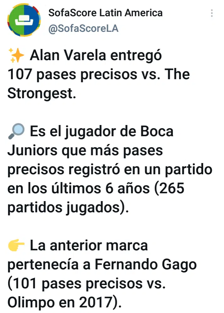 Alan Varela contra The Strongest entregó 107 pases precisos, lo que lo convierte en el futbolista Xeneize que más registró en un partido en los últimos 6 años, en donde Boca disputó ni más ni menos que 265 encuentros. Dicha extraordinaria marca superó a la de ni más ni menos que Fernando Gago, cuyo registro más alto había sido ante Olimpo en el 2017, donde completó 101.