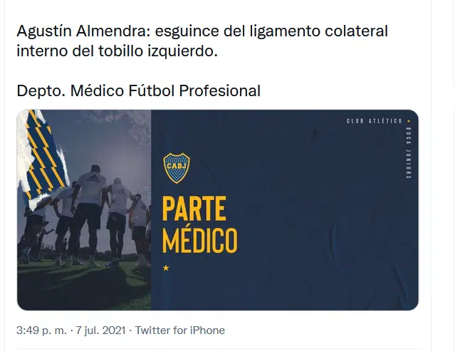Malas noticias para Boca y para Miguel Ángel Russo. Agustín Almendra sufrió un esguince del ligamento colateral interno del tobillo izquierdo y se perderá, como mínimo, el partido de ida ante Atlético Mineiro por los octavos de final de la Copa Libertadores. Así lo comunicó el club mediante sus redes sociales oficiales. Almendra había sido titular en el amistoso de pretemporada ayer que Boca le ganó a Sarmiento de Junín.