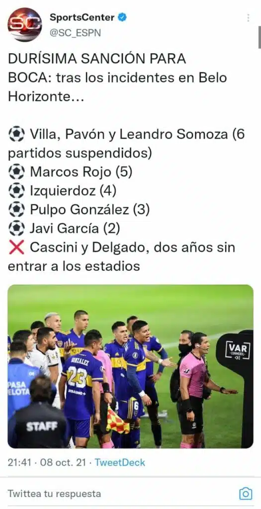 Si bien días atrás se rumoreaba como iban a ser las sanciones, ayer por la noche se confirmó oficialmente tras un comunicado. Esto no cayó bien en el mundo xeneize y también se espera que haya sanciones a los árbitros que perjudicaron al conjunto boquense en ambos partidos. Juan Román Riquelme en la semana declaró que habían ganado en buena ley los dos partidos, pero se lo arrebataron.