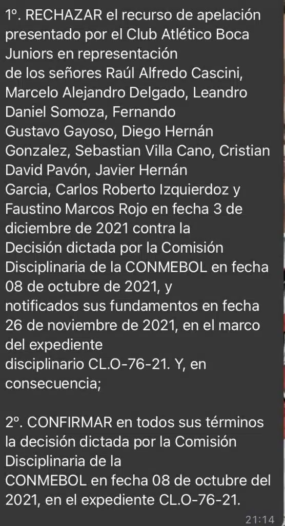 El pasado 3 de diciembre de 2021, Boca Juniors había presentado una apelación a la Conmebol a raíz de la dura sanción que recibieron algunos jugadores por los incidentes ocurridos en la revancha por los octavos de final de la Copa Libertadores ante Atlético Mineiro. Pese a esta decisión, el “xeneize” puede ir al TAS para intentar reducir las penas.
