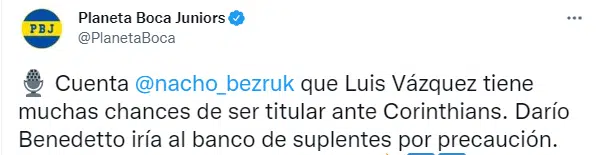 “Luís Vázquez tiene muchas chances de ser titular mañana frente a Corinthians. Benedetto por precaución podría ir al banco de suplentes“, informó Ignacio Bezruk, reconocido periodista de TNT Sports. Recordemos que el Pipa fue reemplazado a pocos minutos del final en Santiago del Estero y encendió las alarmas de todo el mundo Boca.