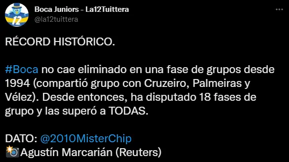 ¿Cuál es el récord que tiene la institución? Según las estadísticas que se brindaron en el día de ayer, desde el año 1994 Boca ha tenido 18 participaciones en la copa Libertadores. En todas ellas ha superado la fase de grupos. Este dato lo pone como el mejor equipo a la hora de afrontar este tipo de compromisos. De hecho, es considerado como un equipo copero.