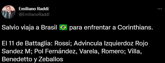 Según la información que contó el periodista Emiliano Raddi, pese a todos los problemas finalmente Eduardo Salvio viajará a Brasil para jugar el partido frente a Corinthians. Esto también está dado por una serie de condiciones que tiene el plantel que dirige Sebastián Battaglia. Ante la falta de extremo, el delantero dirá presente en su último partido.