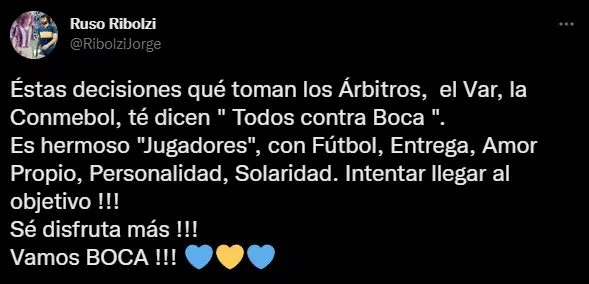 El que encendió la mecha fue el Ruso Ribolzi. En su cuenta de instagram, el ídolo de la institución fue muy duro: “Éstas decisiones qué toman los Árbitros, el Var, la Conmebol, te dicen todos contra Boca . Es hermoso Jugadores, con Fútbol, Entrega, Amor Propio, Personalidad, Solidaridad. Intentar llegar al objetivo se disfruta más.