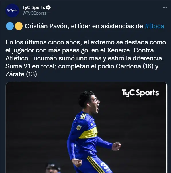 Tras ese curioso dato, el atacante xeneize estuvo un año fuera del club. Porque estuvo a préstamo en la MLS. Aún así, sigue liderando ese rubro. Ante Atlético Tucumán llegó a 21 asistencias en las últimas 5 temporadas. Atrás del extremo figuran Edwin Cardona con 16 pases gol y un poco más atrás aparece Mauro Zárate con 13.