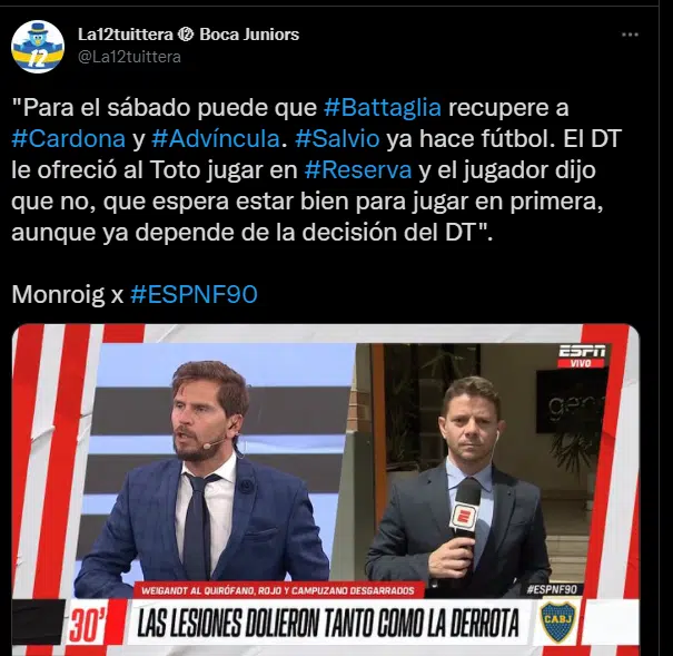 Eduardo Salvio todavía no ha podido estar entre la lista de concentrados luego de su lesión ligamentaria. El entrenador de Boca, Sebastián Battaglia le ofreció adquirir minutos en reserva para sumar rodaje futbolístico. “Dijo que no” señaló Diego Monroig sobre esta posibilidad. Por ese motivo el cuerpo técnico xeneize se mostró enojado con el futbolista.