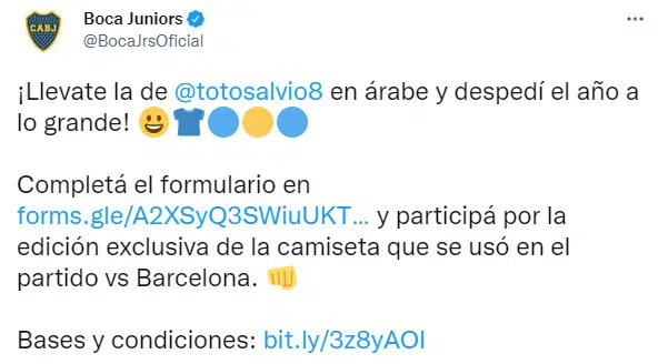 A horas de finalizar el 2021, la cuenta oficial de Boca lanzó un sorteo para poder ganarte la camiseta que utilizó uno de los jugadores más desequilibrantes del plantel de Sebastián Battaglia, la de Eduardo Salvio, que fue usada en la victoria por penales ante el Barcelona en Arabia. Un premio para cerrar el año a lo grande y empezar el 2022 con las mejores energías.