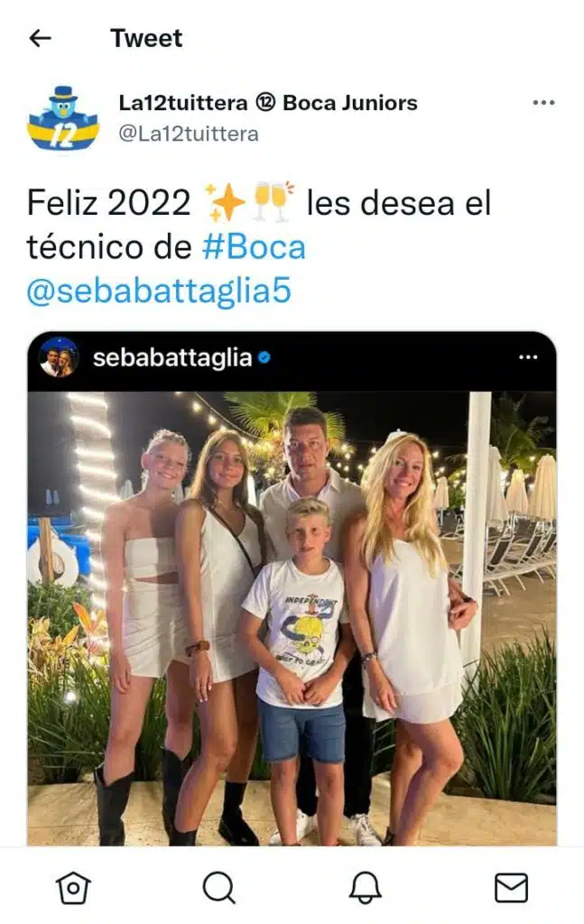 El entrenador de Boca recibió el 2022 rodeado de su familia. Junto a su esposa y sus tres hijos, Sebastián Battaglia se vio contento de empezar un año mas. El dT de Boca tiene muchos motivos por el cual brindar para cerrar el año. Su renovación en el club y haber terminado el 2021 con un título y clasificando a la Copa Libertadores de este año.