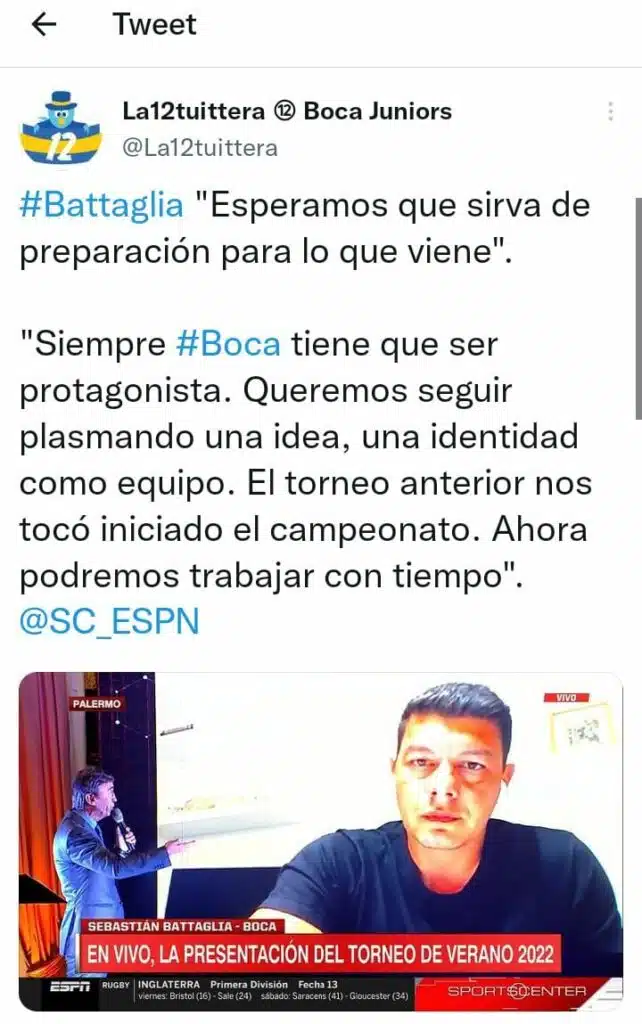 El entrenador de Boca, Sebastián Battaglia, habló en la presentación del Torneo de Verano 2022 y realizó una fuerte revelación. En ese sentido, dejó varios títulos acerca de su presente en el xeneize. Allí afirmó: “Siempre Boca tiene que ser protagonista. Queremos seguir plasmando una idea, una identidad como equipo. El torneo anterior nos tocó iniciado el campeonato. Ahora podremos trabajar con tiempo“.