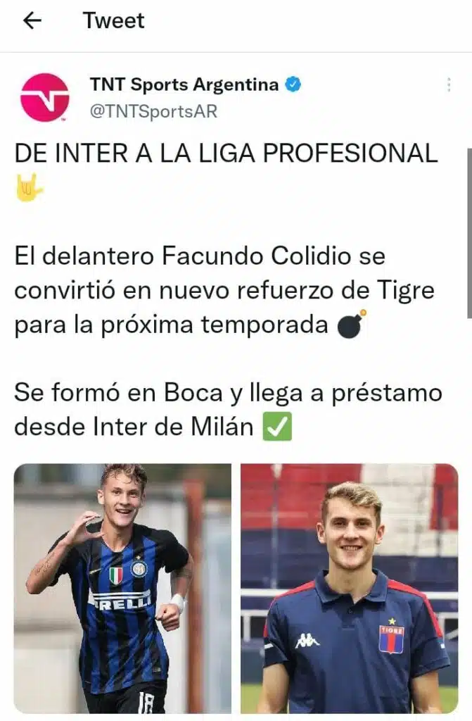 El exdelantero de Boca, Facundo Colidio, fue figura y brilló en las divisiones inferiores xeneizes. Lo compró por el Inter de Italia por una cifra millonaria y realizó sus primeras armas en Europa. Esto fue en el año 2018: cuatro años más tarde, volverá al fútbol argentino para jugar en el recién ascendido Tigre, a préstamo por una temporada.