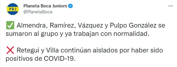 Por su parte, Sebastián Villa y Mateo Retegui que retornó del préstamo en Talleres de Córdoba dieron positivo en los testeos PCR realizados el viernes en el Centro de Entrenamiento de Ezeiza y deberán permanecer aislados hasta recibir el alta médica. Si no surge ningún imprevisto, antes de que finalice la semana, estarán con el plantel.