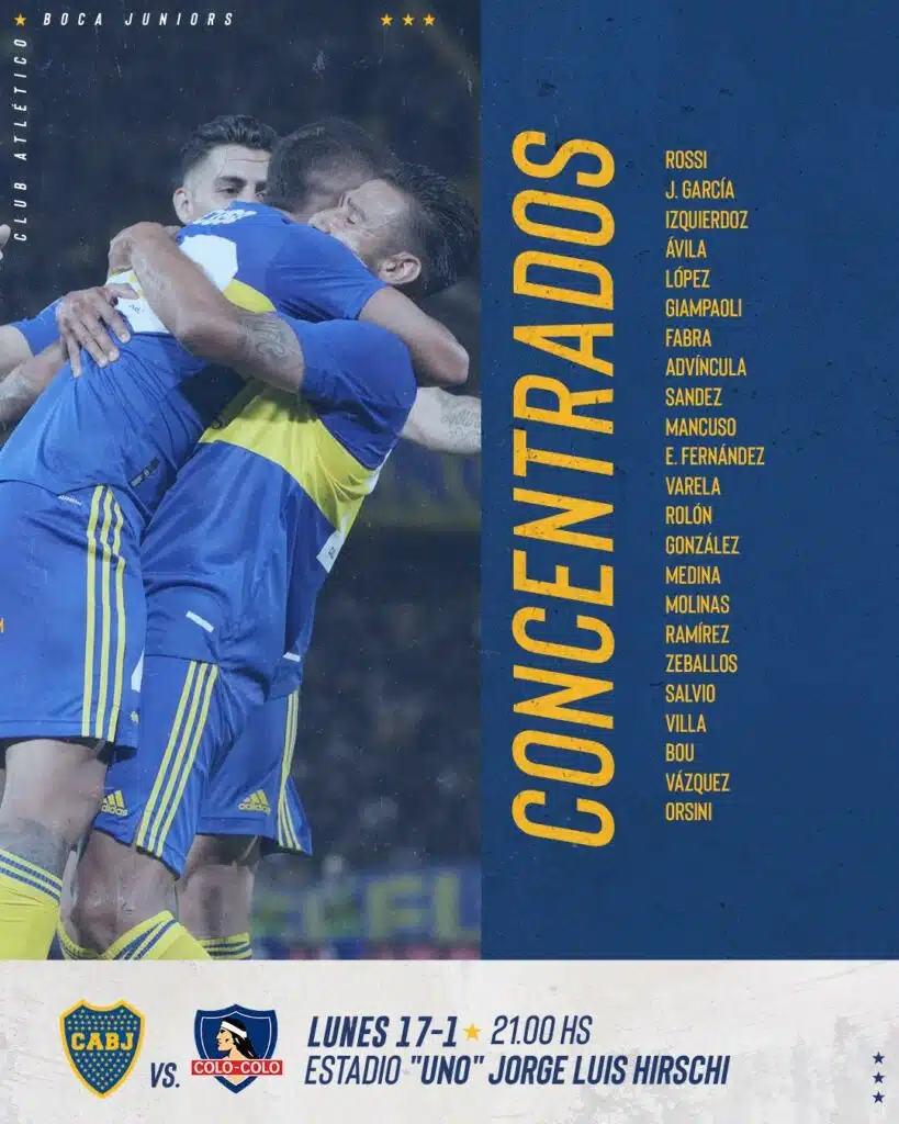 Un probable equipo para enfrentar mañana al conjunto chileno sería: Rossi; Advíncula, Izquierdoz, Ávila, Fabra; González, Campuzano, Ramírez; Salvio, Orsini y Villa. Mientras tanto, el consejo de fútbol trabaja para que los refuerzos lleguen lo antes posible. Aún queda un mes de pretemporada, la cual Boca está realizando en el predio de Ezeiza.