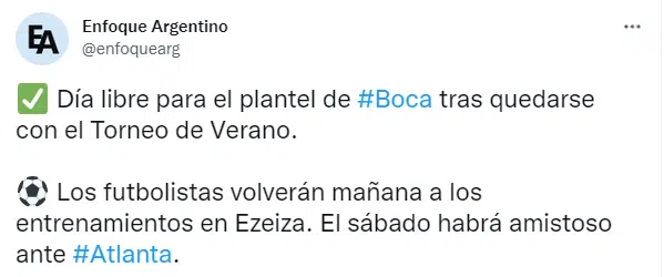 El plantel del Xeneize tiene el día libre y volverá a entrenarse mañana a las 9.30 en el predio que el club tiene en Ezeiza. En ese mismo lugar será el próximo partido amistoso del equipo que dirige Sebastián Battaglia: el sábado frente a Atlanta. Si bien no se sabe como va a formar el equipo, se esperan bastantes cambios en comparación al último partido.