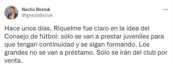 El periodista Ignacio Bezruk reveló cuál es la intención de Juan Román con el plantel del Xeneize. “Hace unos días, Riquelme fue claro en la idea del Consejo de fútbol: sólo se van a prestar juveniles para que tengan continuidad y se sigan formando. Los grandes no se van a préstamo. Sólo se irán del club por venta”, aseguró.