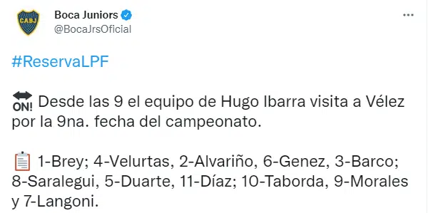 La Reserva de Boca se medirá esta mañana frente a Vélez Sarsfield. El partido correspondiente a la novena jornada de la Copa de la Liga Profesional 2022 se disputará desde las 9.00 en el predio del local. El equipo comandado por Benjamín Ibarra va con la intención de quedarse con los tres puntos y obtener su tercera victoria en el campeonato.