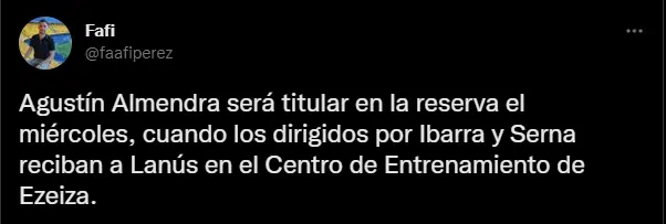 ¿Qué es lo que decidió el club? La semana pasada, Agustín Almendra había vuelto a sumar minutos en reserva. De hecho lo hizo ingresando desde el banco de los suplentes. Sin embargo, en estas horas Hugo Ibarra redobló la apuesta. El cuestionado mediocampista será titular en la división hasta el mes de junio en todos los encuentros que dispute esa categoría.