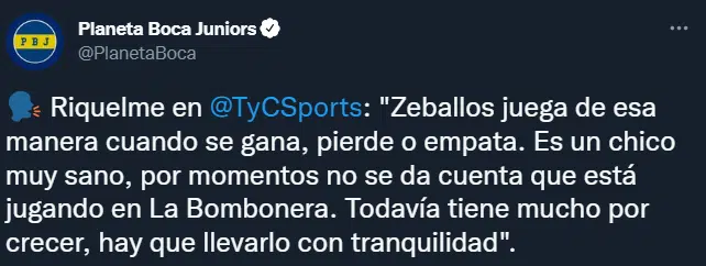 Román habló con TyC Sports y destacó las habilidades del Changuito. “Zeballos juega de esa manera cuando se gana, pierde o empata. Es un chico muy sano, por momentos no se da cuenta que está jugando en La Bombonera. Todavía tiene mucho por crecer, hay que llevarlo con tranquilidad”, expresó el vicepresidente del Xeneize.