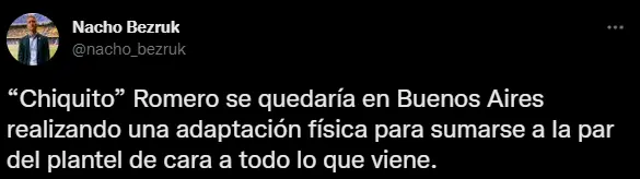Según la información que publicó el periodista Ignacio Bezruk, Sergio Romero se estará quedando en Buenos Aires durante esta semana. La intención de Hugo Ibarra es que haga una mini pretemporada para poder estar a la par del grupo durante las próximas semanas. Por eso mismo no estaría viajando a Salta junto al resto de la delegación xeneize.