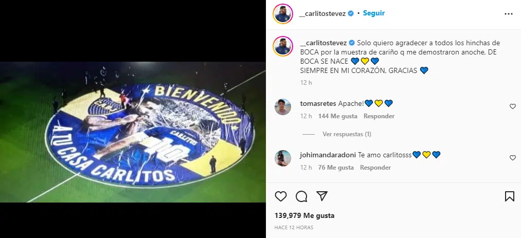 Horas después del empate sin goles entre el Xeneize y el Canalla, Carlitos le dedicó unas palabras al pueblo boquense: “Solo quiero agradecer a todos los hinchas por la muestra de cariño que me demostraron anoche. De Boca se nace. Siempre en mi corazón, gracias”, expresó el Apache en una publicación de su cuenta oficial de Instagram.