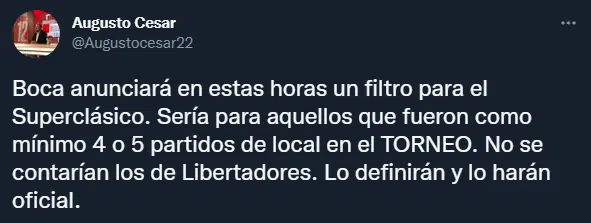 Según informó el periodista Augusto Cesar, a través de su cuenta de Twitter, Boca anunciará en estas horas un filtro para el Superclásico. Este mismo daría prioridad de asistencia contra el Millonario a aquellos que fueron como mínimo a cuatro o cinco partidos de local en este torneo. Cabe destacar, que no se contarían los de Copa Libertadores.