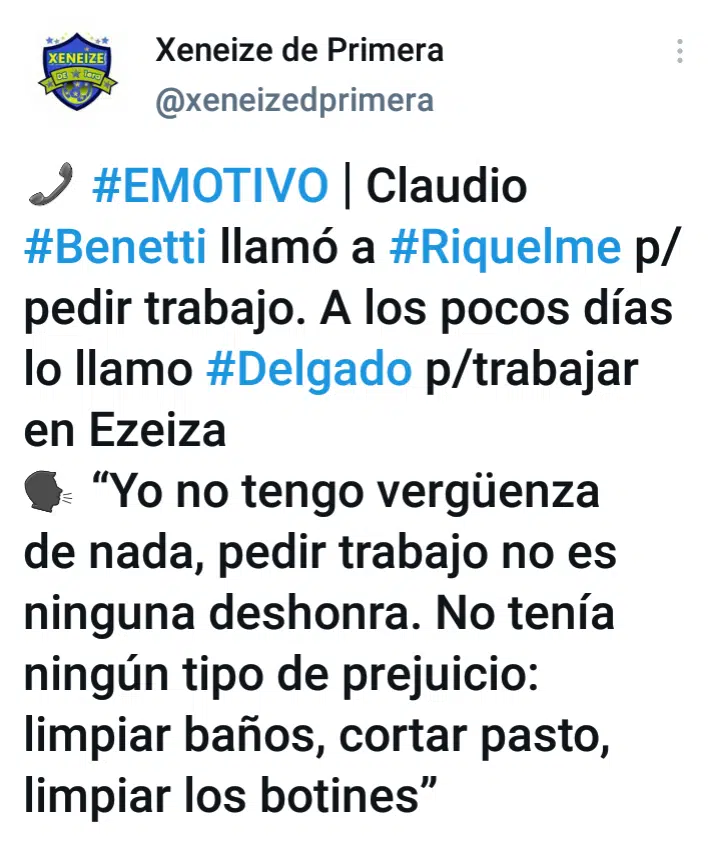 A partir de allí, días después Marcelo Delgado integrante del Consejo de Fútbol, llamó al exfutbolista de la institución para darle un puesto en Ezeiza como coordinador de las divisiones juveniles junto con Roberto Pasucci. Tras el hecho, el mismo Claudio Benetti compartió lo siguiente. “Yo no tengo vergüenza de nada, pedir trabajo no es ninguna deshonra. No tenía ningún tipo de prejuicio: limpiar baños, cortar pasto, limpiar los botines”.