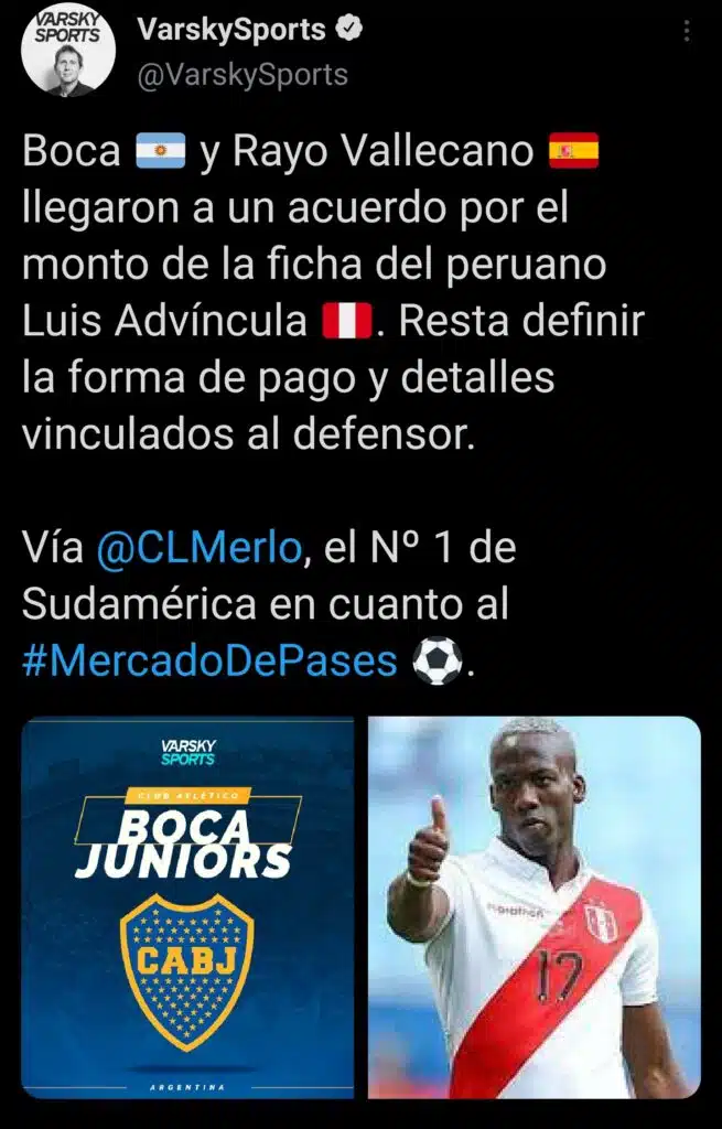 Según confirmó Cesar Luis Merlo, y difundió Juan Pablo Varsky, dos de los periodistas con mayor prestigio en el país, el club acordó con Rayo Vallecano el precio de la transferencia de Luis Advíncula. De esta manera, solo restaría resolver la forma de pago y algunos detalles con el futbolista, que no fueron comunicados.