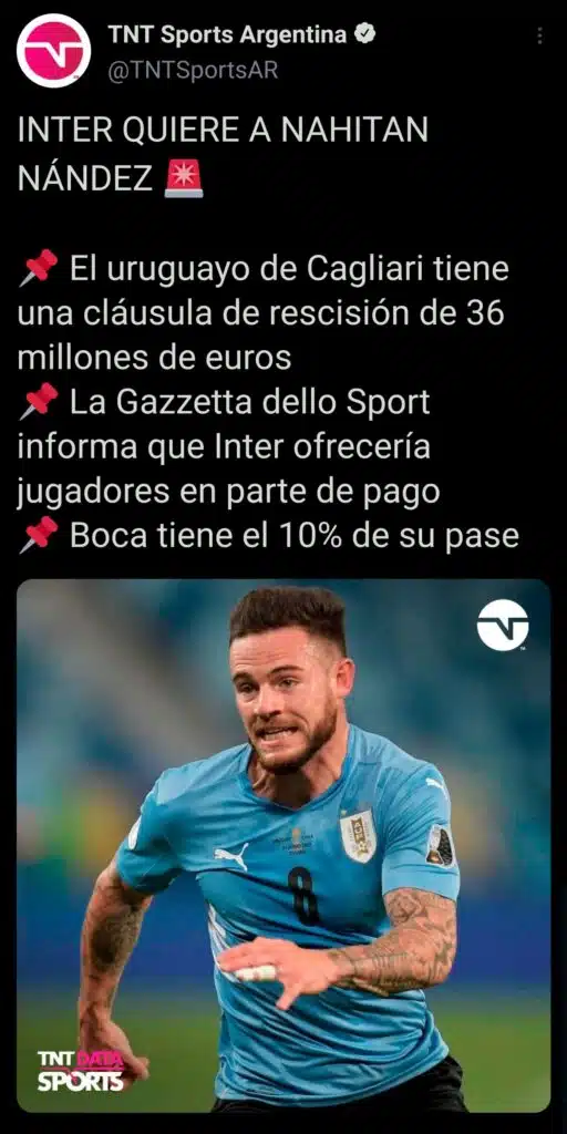 Según anunció el medio italiano La Gazzetta dello Sport, el Inter de Milán estaría tras los pasos de Nahitan Nández. El uruguayo tuvo una gran temporada en el Cagliari y podría dar el salto al último campeón del Scudetto. ¿Qué tiene que ver Boca en esto? Simple: tras su venta, se quedó con un 10% del pase del jugador. De esta manera, podría ingresar al club una cifra millonaria, similar al precio que, por ejemplo, Palmeiras pide por el 50% de Miguel Borja.