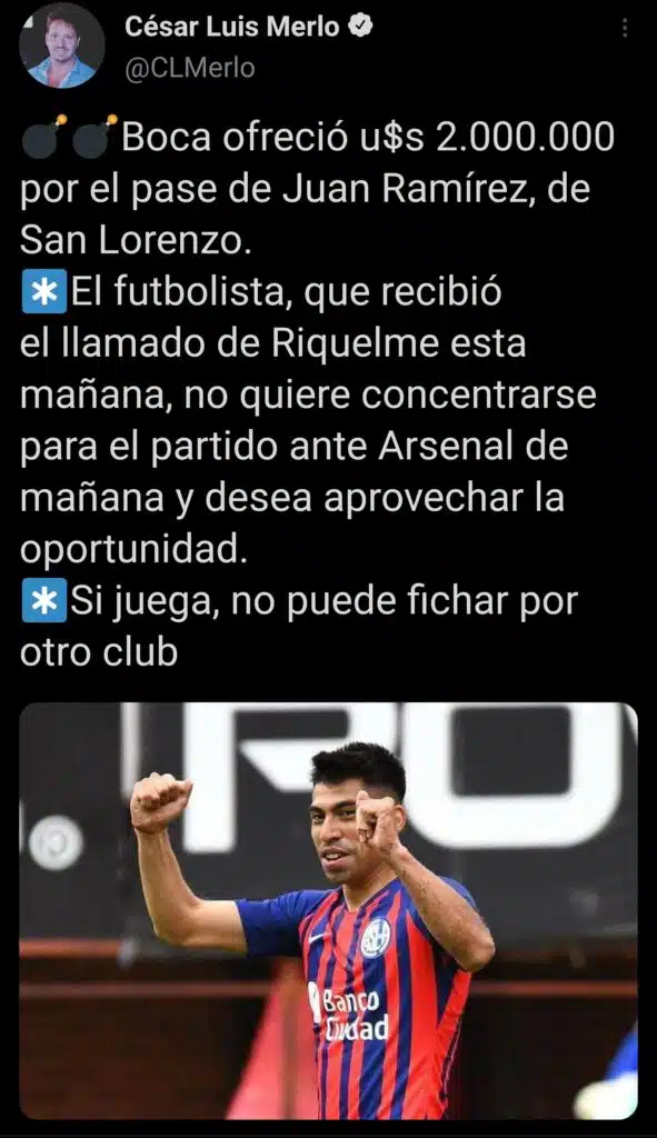 ¿De quién hablamos? De Juan Ramírez, mediocampista de San Lorenzo de Almagro. El periodista expresó que Riquelme lo llamó esta mañana y lo convenció de jugar en Boca. Recordemos que River Plate y, en especial Marcelo Gallardo, estaban muy interesados en adquirirlo, a tal punto que hizo una oferta que fue rechazada por los de Boedo.