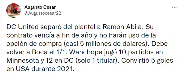Llega fin de año y los clubes deben decidir con qué futbolistas contar y con cuales no. En este caso, el DC United de la MLS de los Estados Unidos tomó una decisión poco feliz en cuanto al futuro de Ramón Wanchope Abila, quien está a préstamo en el club: no continuará en la institución y deberá regresar a Boca, ¿sigue en el Xeneize o se vuelve a ir?.