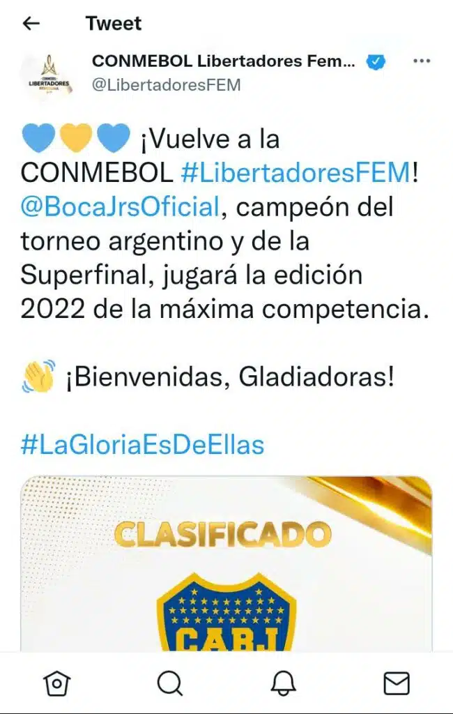 Luego de quedarse con el Torneo Clausura 2021 y la Superfinal ante San Lorenzo, las Gladiadoras se clasificaron a la próxima Copa Libertadores, volviendo luego de no participar en la edición anterior. La cuenta oficial de Conmebol Libertadores Femenina le dio la bienvenida al plantel de Boca Juniors. Una vez más dirán presente en la máxima competencia.