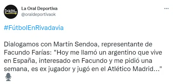 En la tarde de ayer quien habló fue el representante del juvenil, Martín Sendoa, quien realizó una fuerte advertencia a los grandes del fútbol argentino ya que apareció un equipo europeo que tanteó su presente. “Esta mañana ya me llamó uno de los equipos grandes”, aseguró y reveló: “Y me llamó un argentino que vive en España, interesado en Facundo. Es exjugador y jugó en el Atlético Madrid”.