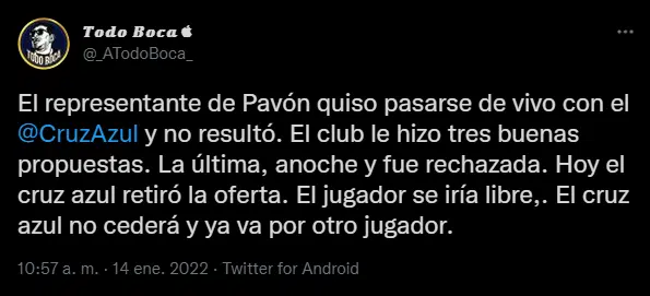 Según la información del periodista Sebastián Infanzón, Cruz Azul retiraría la oferta por el delantero. En esta oportunidad no hay otro club con los deseos de seguir teniendo al futbolista. Se habló de la posibilidad de Atlético Mineiro, sin embargo todavía no hubo una oferta formal. Lo más probable es que Cristian Pavón quede con el pase en su poder.