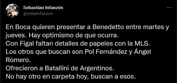 Según la información que pudo brindar el periodista Sebastián Infanzón, quien cubre la actualidad del club pudo confirmar diversas informaciones certeras sobre el mercado de pases. Boca está apuntando a cuatro nombres puntuales: en primer lugar, Darío Benedetto. Después restan algunos detalles para cerrar a los otros tres futbolistas.