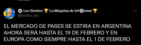 Según la información que brindó el periodista Leo Benítez el mercado de pases para los clubes en nuestro país terminará el 19 de Febrero. Por otro lado, los mercados de nivel europeo terminarán el 1 de Febrero. Pero Boca no está buscando jugadores de esas zonas. Aunque el dirigente por el momento está negociando por nombres puntuales.