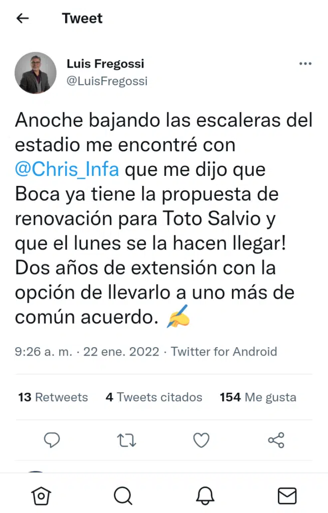 El periodista sostiene que Boca ya tiene la propuesta que le hará a Salvio. La misma es una renovación con una extensión de dos años con la opción de llevarlo a uno mas de común acuerdo. El club le hará llegar el lunes dicha propuesta al volante. Hace un tiempo ya se conocía esa intención del Consejo. Hoy, con el mercado de pases en orden, se hará efectivo todo.