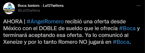 Según las informaciones que se dieron a conocer hace instantes Ángel Romero no jugará en Boca. El atacante guaraní le hizo saber a Juan Román Riquelme que no aceptó la propuesta. ¿El motivo? Algo tan simple: el económico. Le hizo saber a los dirigentes xeneizes que hay una propuesta económica superadora por parte de Cruz Azul.