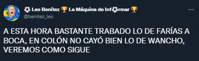 Según manifestó el periodista Leo Benítez en su cuenta de Twitter, el polémico posteo de Wanchope Ábila en su cuenta oficial de Instagram mostrando malestar y pidiendo explicación de parte del consejo de fútbol de Boca sobre su futuro, no cayó para nada bien en la dirigencia de Colón de Santa fe que hasta el momento veía con buenos ojos la posibilidad de que “el nueve” sea parte de la negociación por Farías.
