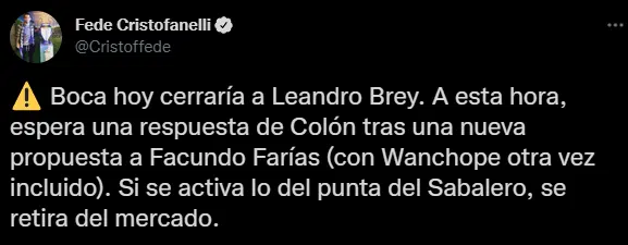 Según cuenta el periodista Federico Cristofanelli, Boca esperará a los últimos días del mercado. El club le hizo una nueva propuesta a Colón para llevarse al delantero, pero todavía aguarda la respuesta. También es cierto que quedan tan sólo 4 días para el cierre del mercado de pases. Ante eso el club trabaja para cerrarlo lo antes posibles.