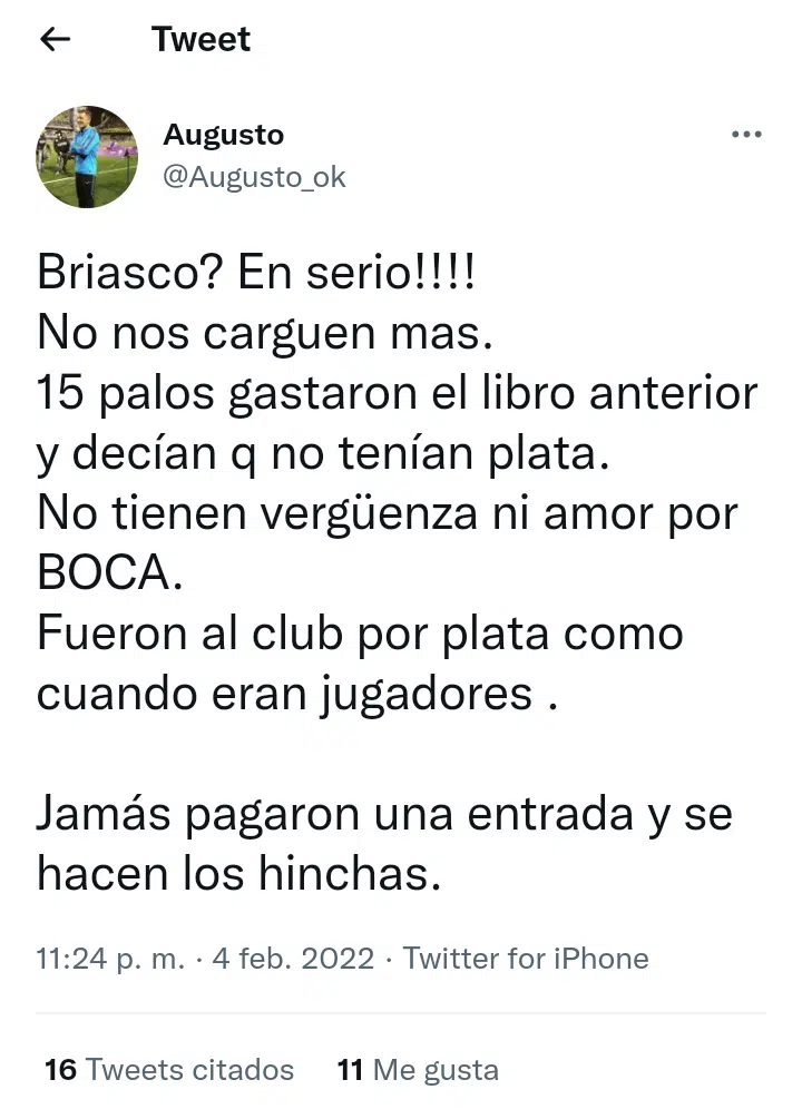 Si algo le faltaba a todo esto era una fuerte crítica hacia la dirigencia actual. La oposición no se guarda nada y apunta contra ellos: “No tienen ni vergüenza ni amor por Boca“. El punto de partido fue Briasco, acusando que por el jugador pagaron 15 millones en el mercado anterior. No es novedad que esta dirigencia, con máximo referente que es Riquelme, es muy cuestionada por la anterior o por la oposición.