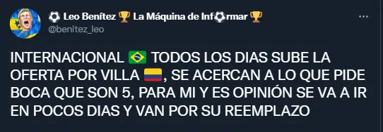 Inter de Porto Alegre estaría cada vez más cerca de llegar a un acuerdo con Boca para incorporar al colombiano Sebastián Villa entre sus filas. El conjunto brasileño no se da por vencido en las negociaciones y se acerca cada vez más al valor que pretende la dirigencia Xeneize por el atacante de 25 años. De concretarse esta operación, el Consejo de Fútbol tendría plazo hasta el 19 de febrero para adquirir a otro jugador.