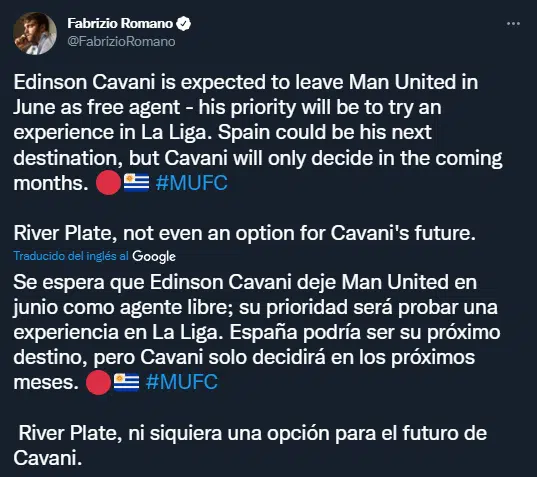 Según lo que informó el periodista Fabrizio Romano, en su cuenta oficial de Twitter ante los rumores, Cavani no tendría intenciones de jugar en River a partir de mitad de año. Esta información cayó muy bien en Boca, que todavía sueña con tener al goleador Uruguayo en su equipo, a pesar de que en la misma publicación, se remarcaba que probablemente Edison continúe su carrera en la Liga de España.