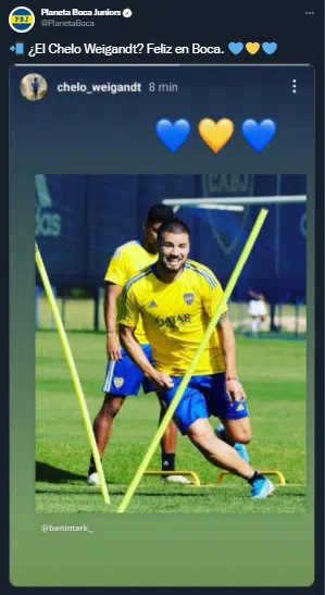 Entre corazones amarillos y azules, sonrisas y entrenamiento, Marcelo Weigandt publicó dos fotos en las que se lo ve felíz con la indumentaria Xeneize. “El Chelo” parecía ser pretendido en los últimos días del Mercado de Pases por Gimnasia de la Plata, club en el que jugó a préstamo. Sin embargo la oferta formal aún no llegó y para Battaglia es considerado un futbolista importante.